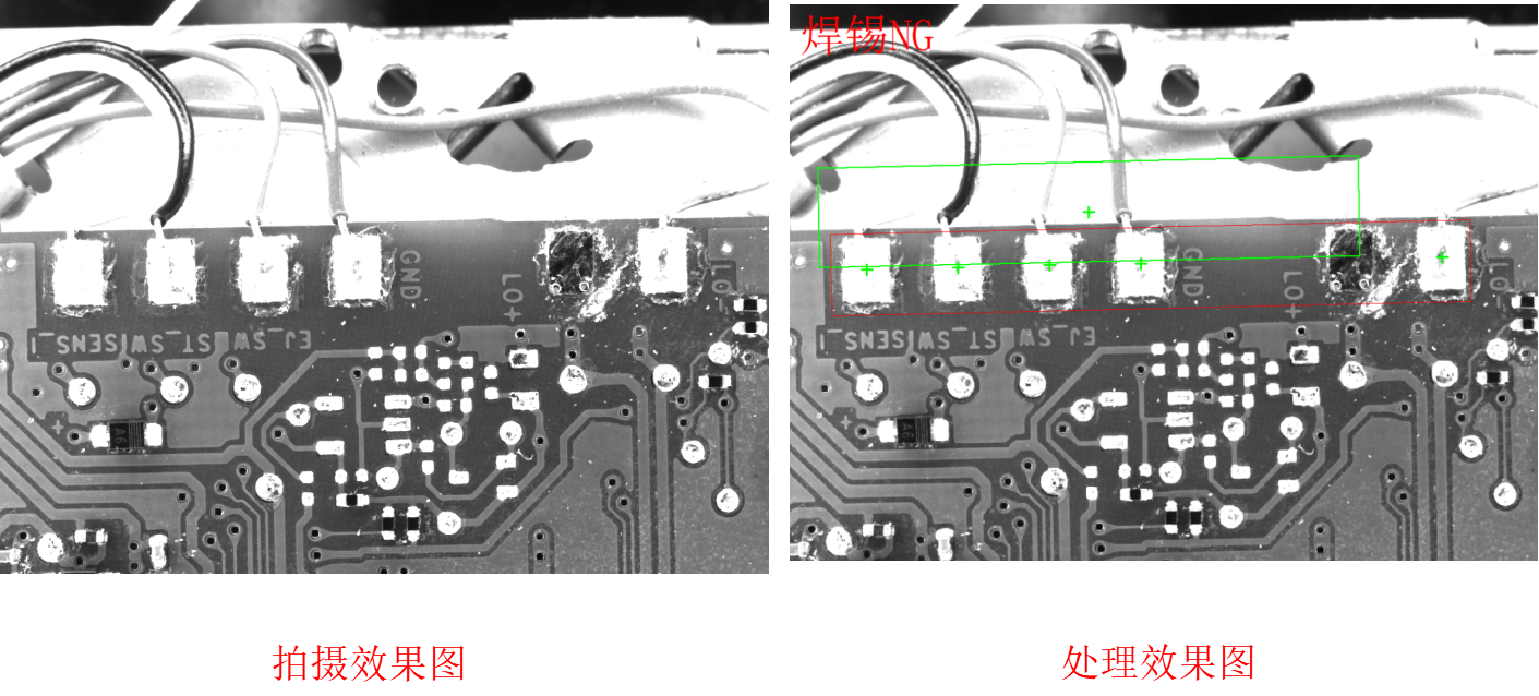 建議使用2個相機拍正反面,相機移動每個檢測位置單獨拍攝。以目前樣品進行實驗來看,可以檢測不良。焊錫可以檢測連焊與缺焊,不過目前樣品中焊錫都有氧化現象,實際樣品的實際效果不知道是否有差異。