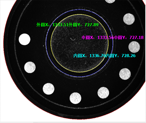 同一產(chǎn)品,在不同位置及光源亮度下進(jìn)行測量,可以發(fā)現(xiàn)圓心位置偏差大概在3個像素左右。對于產(chǎn)品本身是否OK未知,但是穩(wěn)定性,還是可見的,通過前三圖可以得知(最后一幅圖因產(chǎn)品位置變化較大,會引起光學(xué)效果的變化;又因?yàn)橥鈭A邊上有缺口,對外圓的擬合會造成一定的影響,因此外圓與中圓也有3個像素的變化,前面的圖中外圓與中圓是變化小于1像素)。